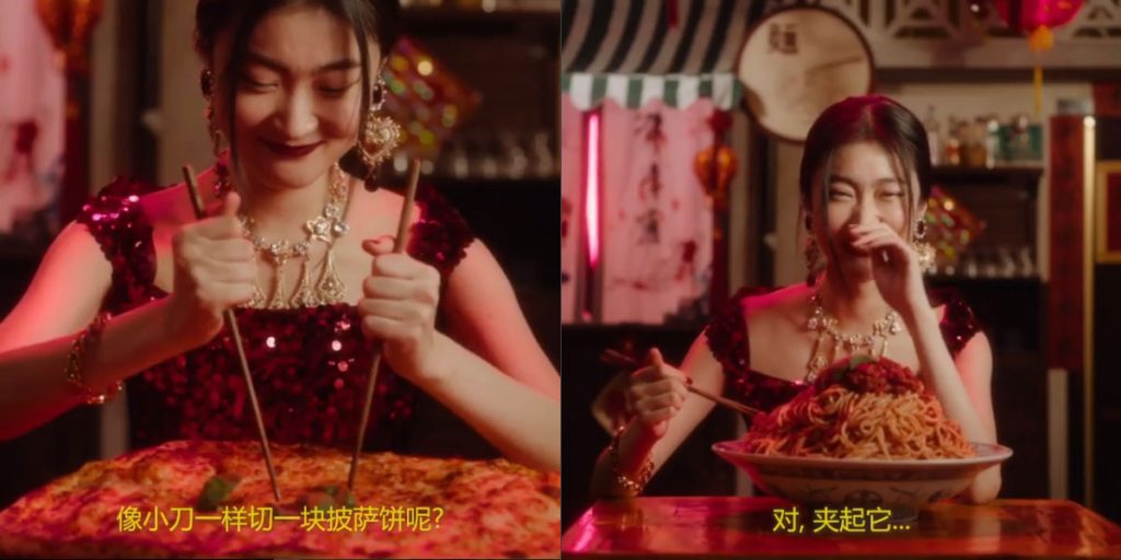 这场辱华风波从一开始就与杜嘉班纳的上海大秀有关。在为之预热的一套系列短片中,一个眯眯眼的中国女孩坐在一家中餐厅里,分别尝试用筷子品尝三种意大利传统美食——披萨、意大利甜卷和意大利面。而当她面对一个大号的甜卷、拿着筷子无从下手的时候,旁白一语双关地问道:“这对你们来说还是太大了吗?”