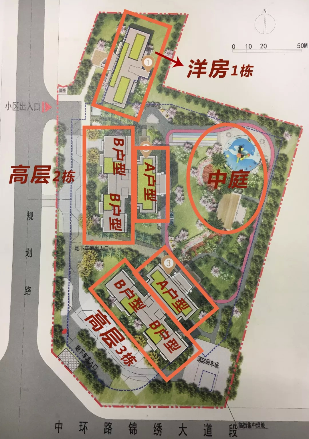 项目占地13亩,里面分为两栋高层及一栋洋房,高层为2栋、3栋,洋房为1栋,共220套住宅。由于项目本身地块较小,放下三栋楼后,所谓的中庭面积可能就是改造成个小花园样式,而对于1栋洋房,等于没有中庭。