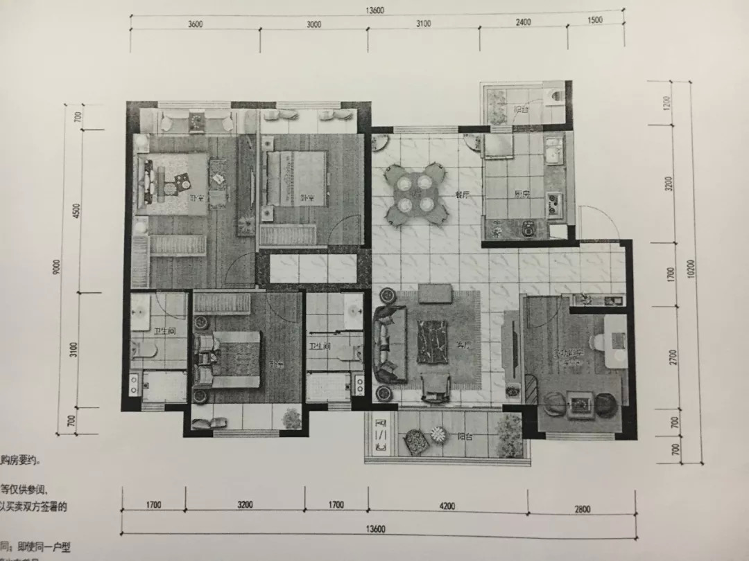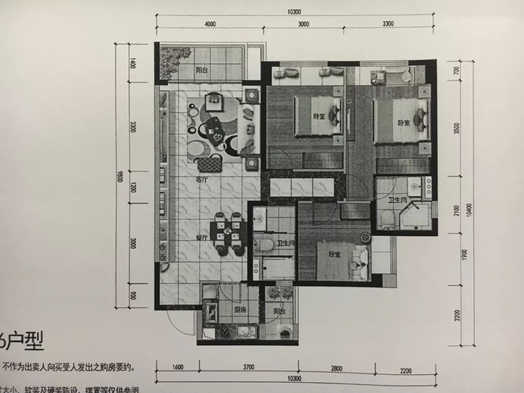 缺点:2栋楼朝向西向,夏天西晒很恼火;这个户型的生活阳台光线被A户型的挡住,采光可能会存在问题。