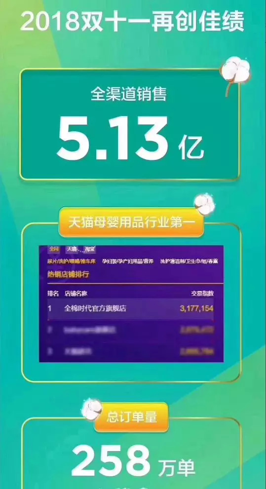 十一月是电商们的狂欢节,大促刚过各路产商就开始纷纷秀起了战果。其中全棉时代全渠道销售额5.13亿元,总订单量258万,并以4.03亿元的交易额自称天猫母婴用品行业第一。