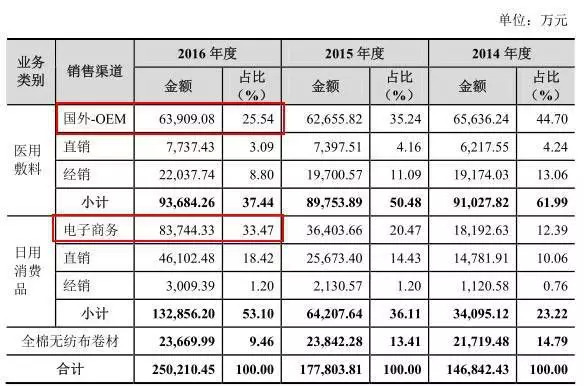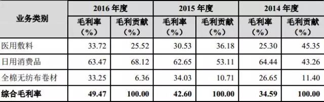 第二、毛利率异常高于同行业。根据招股书中显示,全棉时代产品销售收入从2014年度的34,095.12万元增长至2016年度的132,856.20万元;2016年全棉时代产品毛利率达到了63.47%。由此不难看出,报告期内资金来源比重从主要的医疗用品逐渐向日用消费品倾斜,2016年日用消费品对公司毛利贡献将近7成。