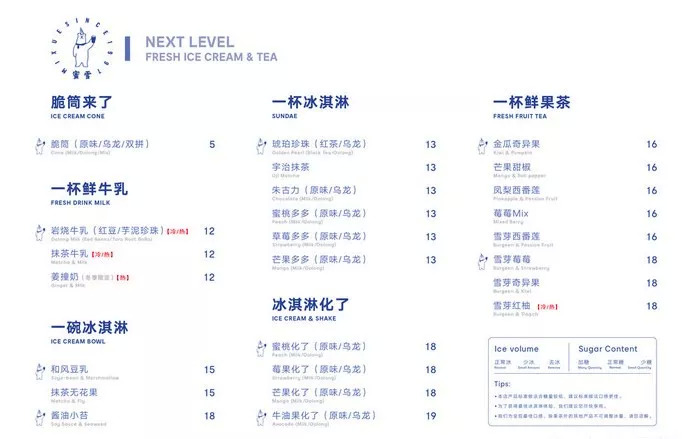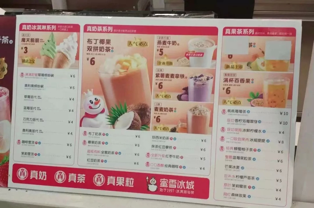 最突出的差异,要算在产品,来看这张蜜雪门店的菜单。