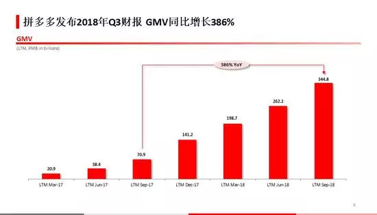 根据第三季度财报,过去12个月平台GMV达3448亿人民币,同比增长386%。第三季度拼多多GMV同比增速更是高达231%。