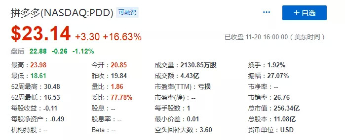 财报发布后,拼多多盘前大涨11.95%,当天高开高走,开盘涨约5%,盘中股价一度逼近24美元,日内涨幅高达20.8%。在当日美股大盘下跌、热门中概股大多下挫时,拼多多一枝独秀,收涨16.63%,收报23.14美元/股,本月以来累计涨逾30%。