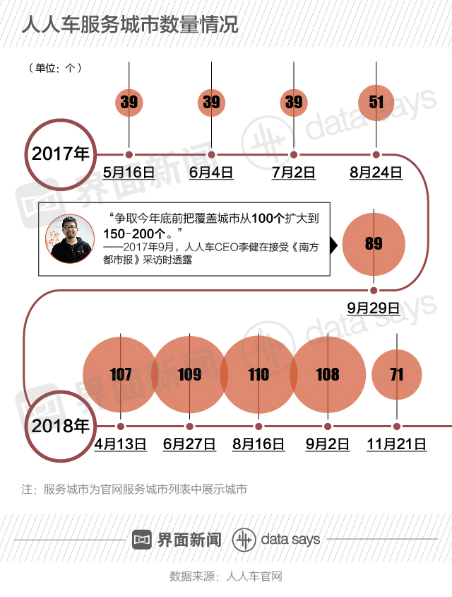 界面数据(公众号ID:tuli_shuju)整理人人车官网发现,截至2018年11月21日,人人车服务城市已经不到百城,仅剩下71个城市。这一数字与人人车CEO李健之前“扩大到150-200个城市”的目标相距甚远。