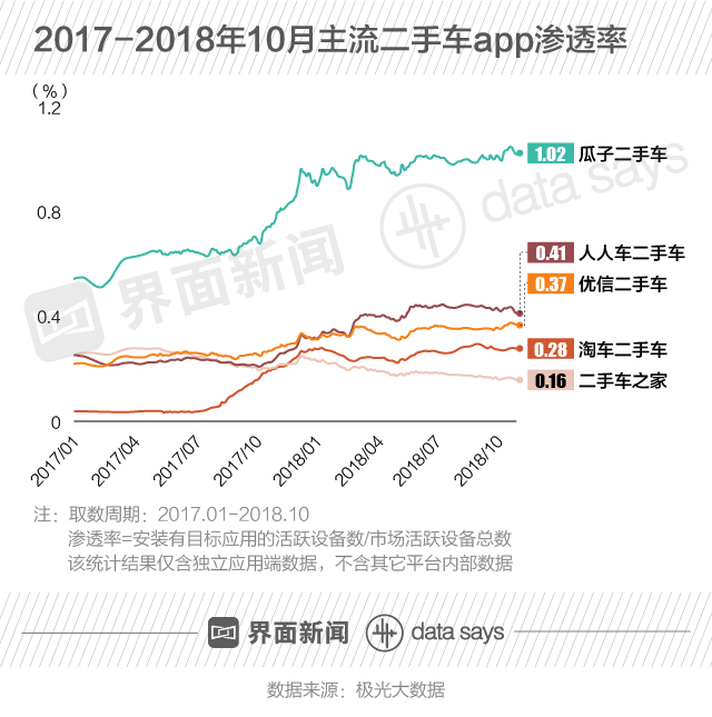 在开启新一轮广告营销后,人人车的app渗透率超过其他竞争对手,位居第二,仅次于瓜子二手车。