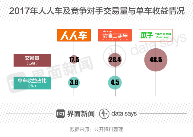 但与主流二手车平台相比,人人车2017年的交易量仅为17.5万辆,单车收益占比仅为3.8%。