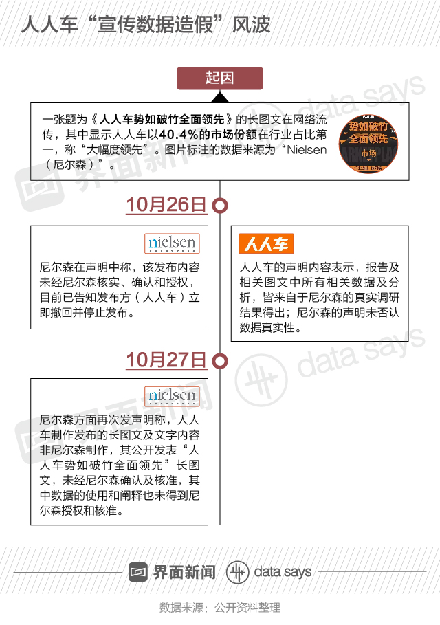此前,人人车一度陷入“宣传数据造假”风波。在《人人车势如破竹全面领先》长图文中,人人车称其以40.4%市场占有率位居行业第一,但随后尼尔森两次发布声明称,此举系人人车单方面自主行为,不是尼尔森的“权威行业报告”。