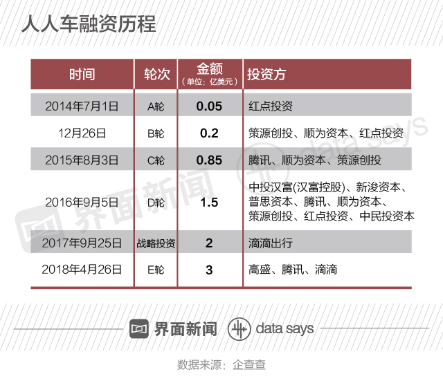 企查查数据显示,人人车目前已经累计完成6轮融资,最近一次融资发生在2018年4月26日,由高盛领投,腾讯、滴滴等跟投。