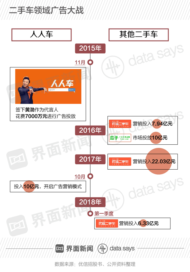 二手车电商竞争激烈,为了获取更多的市场关注,广告已成为另一个战场。2017年10月,人人车宣布投入10亿元用于广告营销,距离它上一次砸钱投广告,已经隔了快2年。