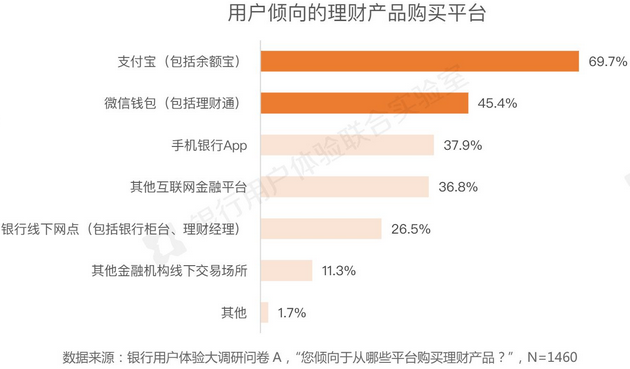 调查还显示,用户在选择购买理财产品时,更倾向于互联网平台。其中选择支付宝平台购买的用户最多,高达69.7%;微信钱包次之,45.4%;对银行渠道的倾向性相对较低,只有37.9%。