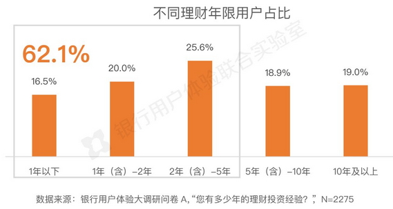 报告发现,受访用户理财经验仍较少,62.1%的用户理财年限在5年以内。同时,不到30%的用户认为自己对理财知识比较了解,绝大多数用户认为自己对理财知识了解程度还不够。