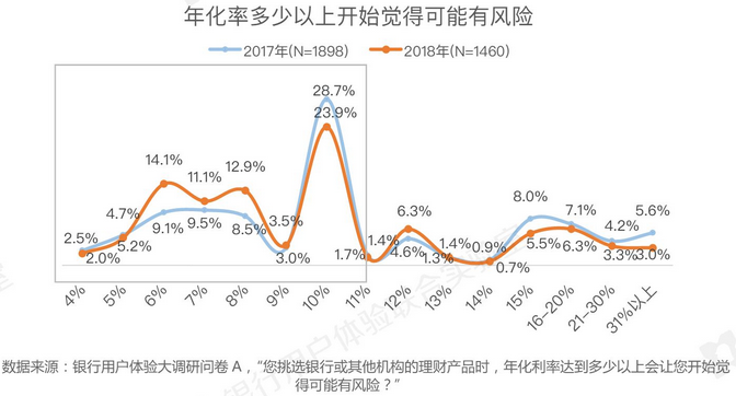 用户在理财产品收益率到达6%时,风险意识显著增加。有受访者表示,“像那种 P2P一般都说是有10%,看着收益是很高,但是现在事情出太多了还是不会考虑。”报告认为,由于多数用户理财投资经验较少受市场环境的影响,对风险更谨慎,对收益的追逐更加理性,因此银行在安全及风险方面具有天然的优势。