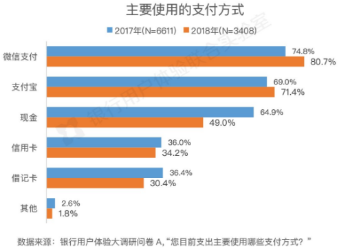 报告显示,微信/支付宝管理流动资金的用户在增加的同时,在传统的银行这一平台管理流动资金的比例还在大幅度下降,由2017年的40%下降至2018年的33.1%,下降了6.9个百分点。