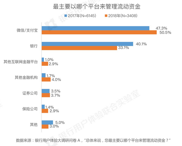 2017年,47.3%的用户主要使用微信/支付宝平台来管理流动资金,2018年这一比例提升至50.5%。