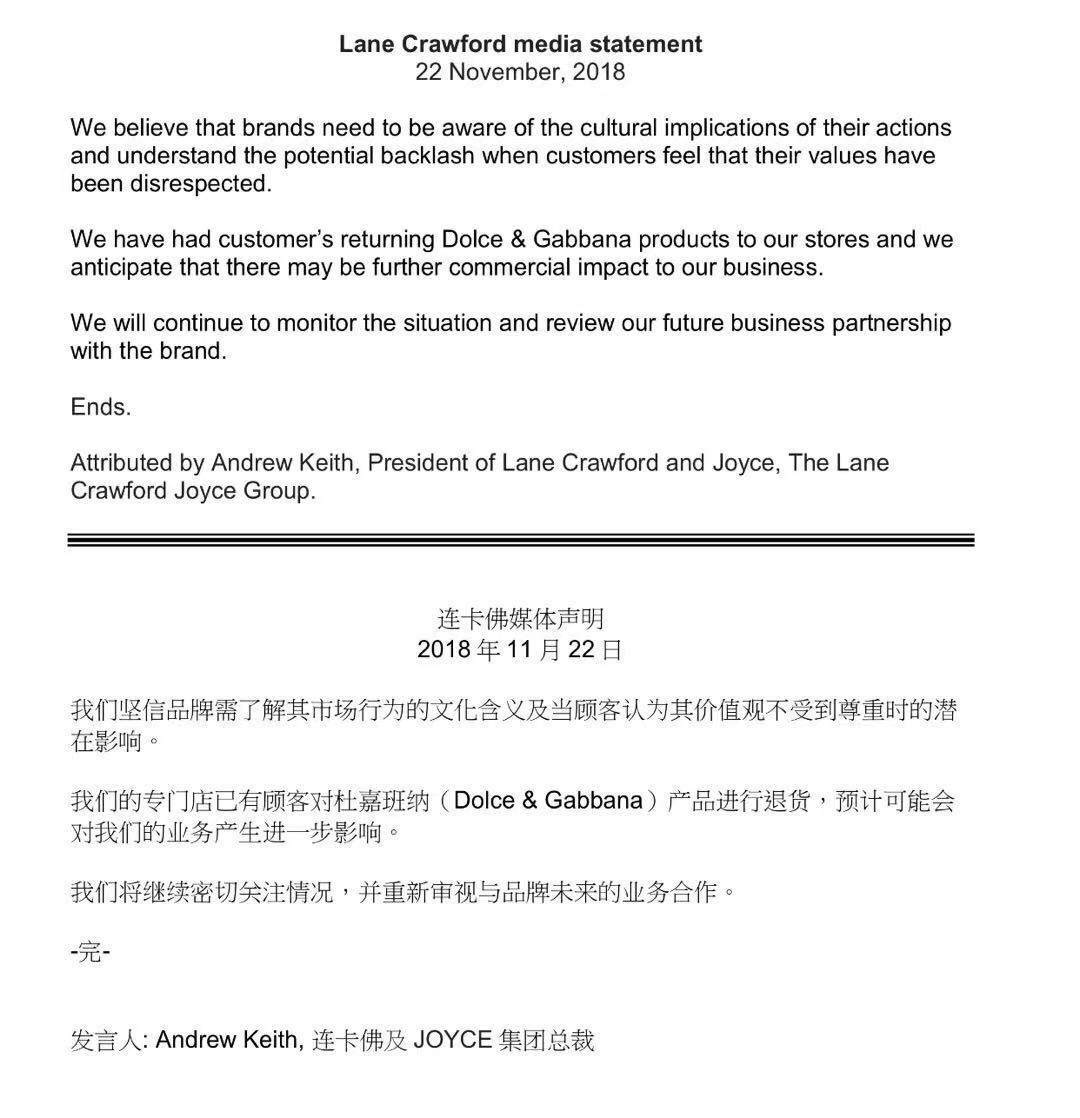 同日,时装百货连卡佛的母公司香港连卡佛及JOYCE集团向英国时装商业评论BoF发布了一份声明,称已有顾客在连卡佛门店中寻求Dolce & Gabbana退货,预计可能会对业务造成影响,将继续关注这一情况,并重审与该品牌未来的合作,签署人为集团总裁Andrew Keith。