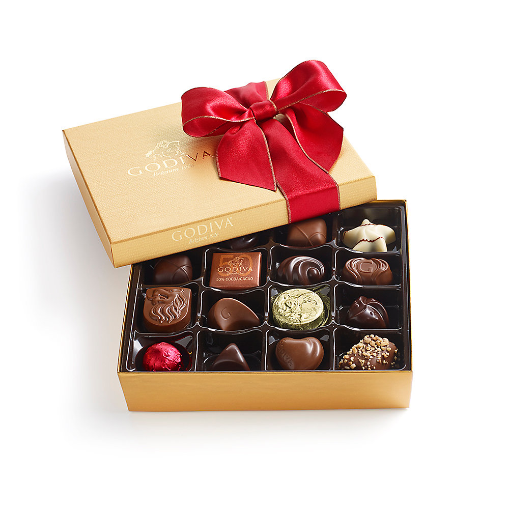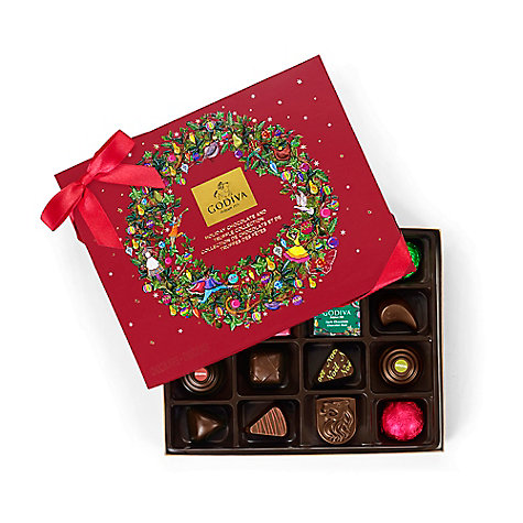 GODIVA推出圣诞限定礼盒,喜庆的红色外壳下是由了牛奶、咖啡、碧根果等制成的丝滑巧克力,光是看着包装盒都能感受到弄弄的蜜意。看来巧克力不只适合情人节,在圣诞节赠送也可以有绵绵情意。