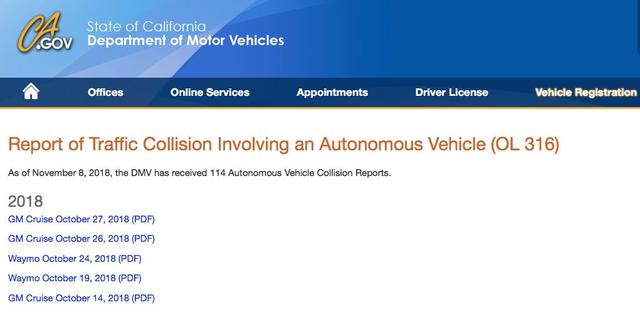 自从加州车管局(DMV)开始发放自动驾驶路测牌照以来,他们便要求进行测试的自动驾驶车要上报所有的交通事故——无论车辆是在自动驾驶模式下还是手动驾驶过程中。