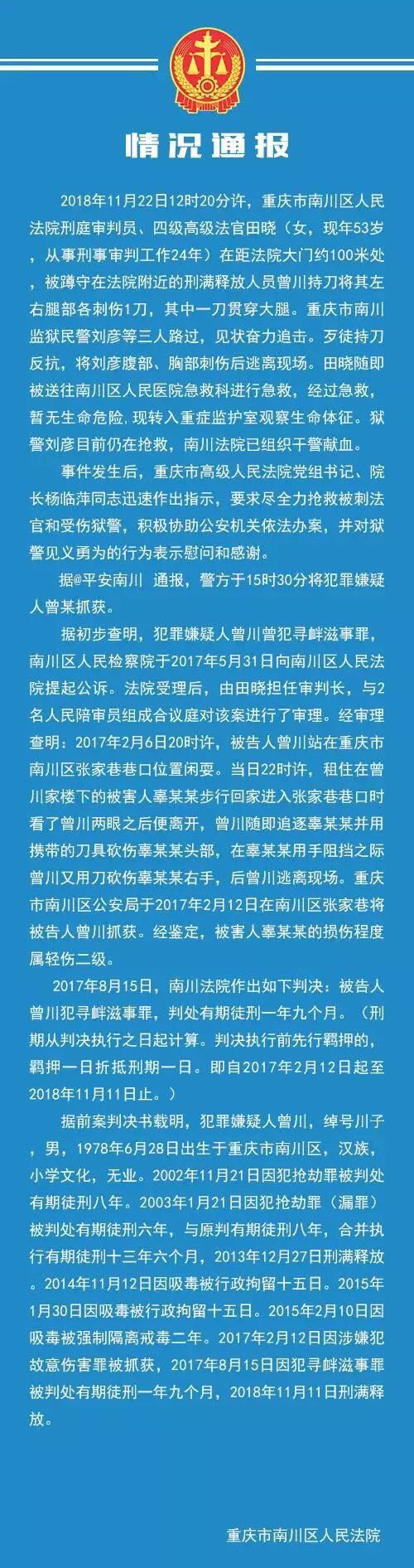 22日12时,重庆市南川区发生一起持刀伤人案件,一歹徒在南川区西城街道文体路附近将田某腿部刺伤,警方于15时30分将犯罪嫌疑人曾某抓获。经核实,该受伤女子为重庆市南川区人民法院刑庭法官田晓,犯罪嫌疑人曾某曾是其经办案件当事人,案发地为南川法院附近。