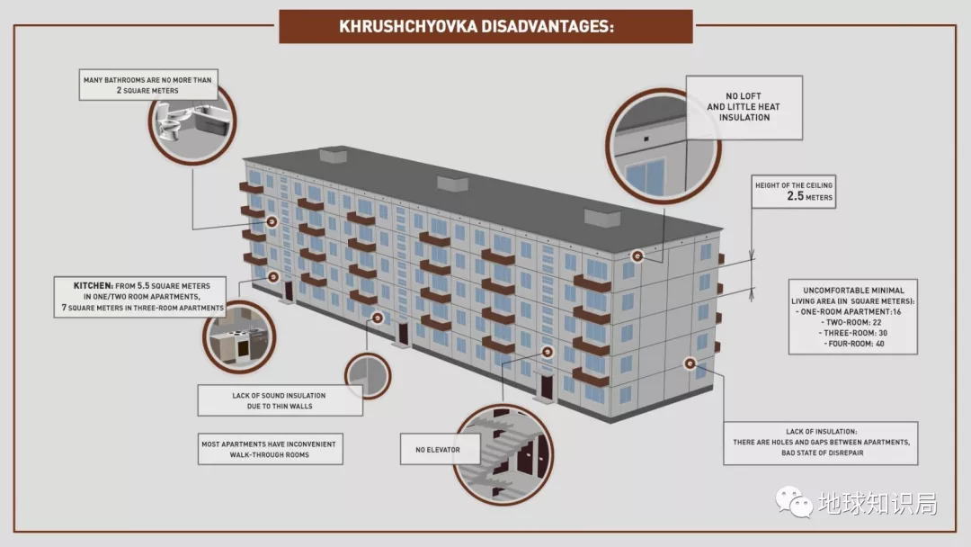 赫鲁晓夫继续精打细算着,恨不能一个戈比掰两瓣儿花。斯大林时代的拱门、柱廊、塔楼、浮雕,皆华而不实,通通拿掉‘高于五层的建筑物必须安装电梯和垃圾通道,所以房屋索性全部五层。