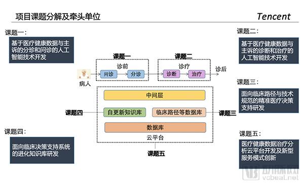 而在大会之上,范伟将整个计划书拆解为五个课题,交由腾讯及合作医院、合作企业共同解决。五个课题覆盖诊前、诊中及后端的决策系统、知识库,具体如下图所示: