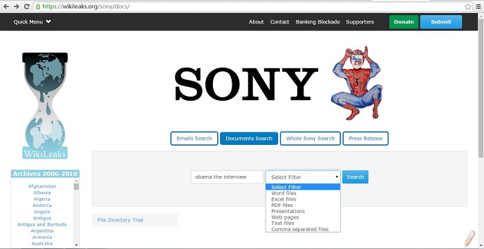 维基解密(WikiLeaks)在其网站上线了名为“索尼档案”的数据库,公布了去年底索尼影业被黑的所有邮件和文档,同时也揭露了这家跨国公司与美国政府之间的联系,以及其他商业操作内幕。