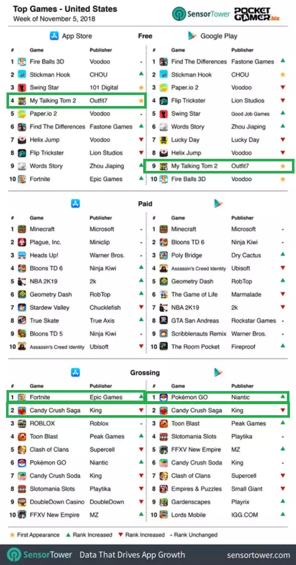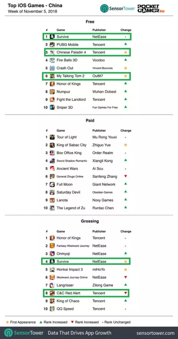 为了让业内人士更好地了解全球手机游戏行业,近期外媒PocketGamer与市场研究机构SensorTower展开了一项合作,对全球主要国家的每周手游榜单(免费榜、付费榜以及畅销榜)进行了整理排名。目前,主要报导的三个主要国家和地区分别为美国、英国及爱尔兰、中国(仅iOS)。本周榜单的时间周期为11月5号-11月11号。
