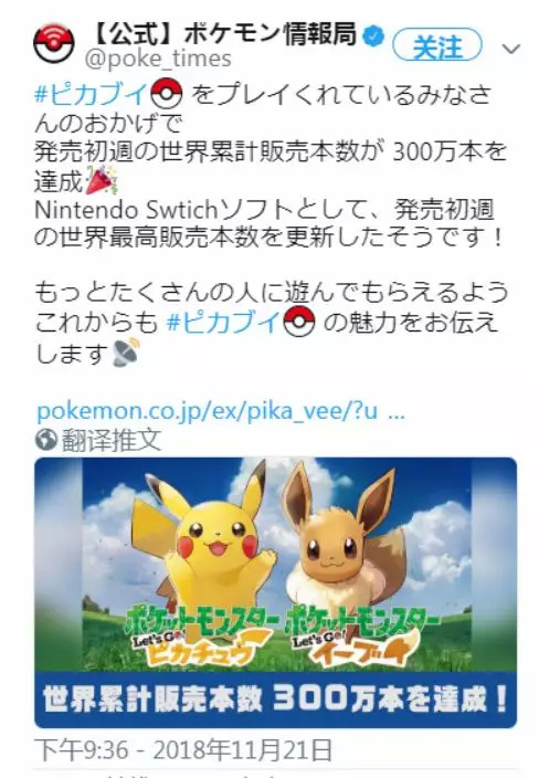 另外,近日据宝可梦官方推特信息,《精灵宝可梦:Let's Go!皮卡丘/伊布》出师告捷,发售首周全球销量就已经突破了300万份,超越此前的《超级马里奥:奥德赛》以及《塞尔达传说:荒野之息》成为了任天堂Switch主机首周销量最高游戏。与此同时,得益于《精灵宝可梦:Let's Go! 皮卡丘/伊布》的助推,Switch硬件在日本的当周销量增加了2倍多,达到了18万台,而前一周仅为5万多台。
