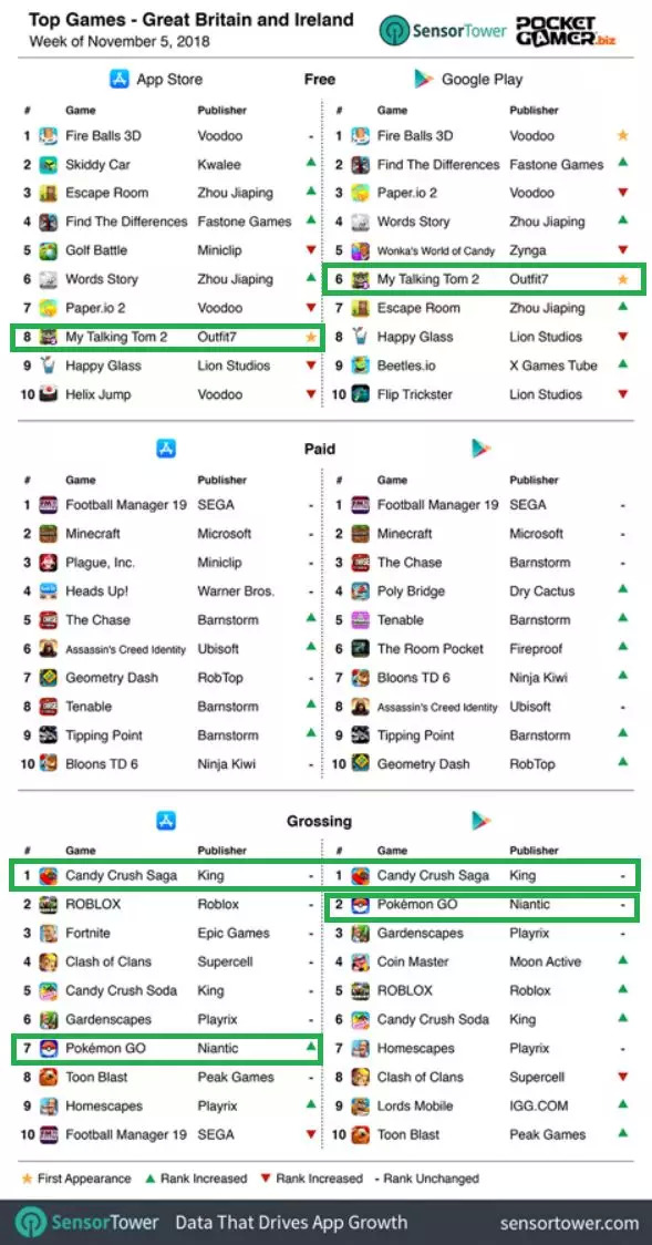 畅销榜方面,King旗下的《糖果传奇》在英国及爱尔兰地区依旧热度不将,继续保持着畅销双榜冠军宝座。此外,Niantic出品的《精灵宝可梦Go》则延续了其在美国市场的强劲势头,从App Store畅销TOP9上升了2个名次至畅销TOP7,而Google Play平台则维持畅销亚军位置。不难看出,得益于新作的助推,《精灵宝可梦Go》未来一段时间的表现值得期待。