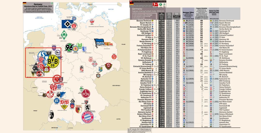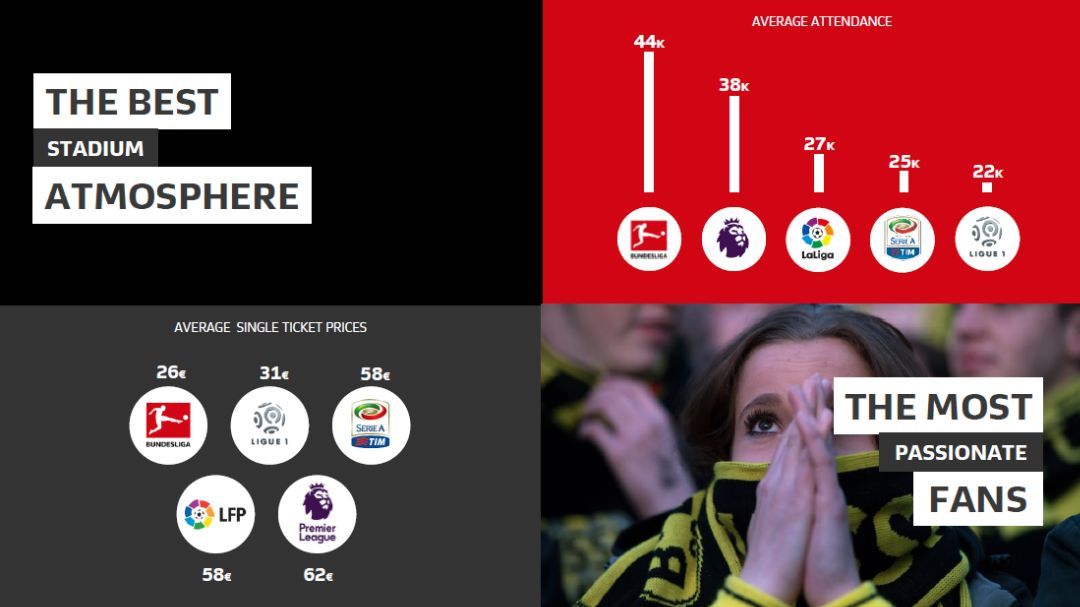 但德甲有所不同,便宜的票价不但不意味着人流稀少供大于求的“商品法则”,反倒还成了五大联赛中场均上座人数最高的联赛。根据德甲官方统计的数据显示,他们场均上座人数达4.4万,力压英超的3.8万排名第一。