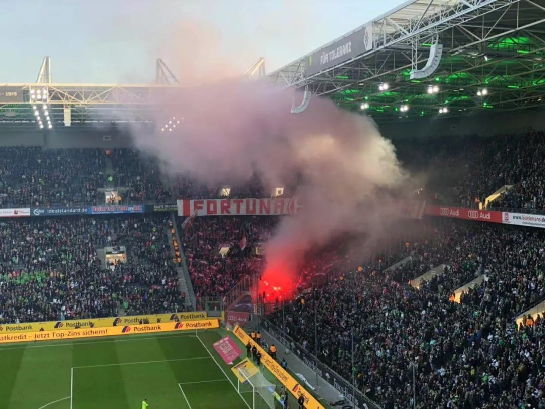 当然,客队球迷也没闲着,杜塞尔多夫作为北威州首府,距离门兴的车程只有一个小时,来的人数并不少。虽然在球场上客队看台只有一个小角落,但身着红衣的杜塞尔多夫球迷们个个以一当十,他们高密度地站在一起,引发出巨大的助威声响,给对侧的主队看台制造压力。
