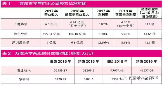 在2017年年底披露的《详式权益变动报告书》中,万魔声学2015年、2016年的营业收入分别为32588.87万元、43674.46万元,净利润分别为3920.99万元、5354.34万元,而本次并购预案中披露的数据却是:万魔声学2015年、2016年的营收却分别为31269.2万元、41637.06万元,净利润分别为3401.6万元、2598.73万元。两版本数据中有多处数据并不相同,其中净利润的差额是最为明显的。预案披露的2016年净利润数据相较《详式权益变动报告书》披露的数据几乎缩减了一半,这意味着,若按《详式权益报告书》中的数据,预案中万魔声学的2017年净利润是同比下滑的。