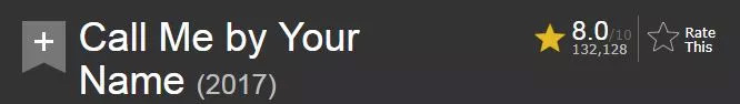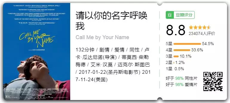[请以你的名字呼唤我]豆瓣评分8.8分,IMDb评分8.0分,烂番茄新鲜度94%
