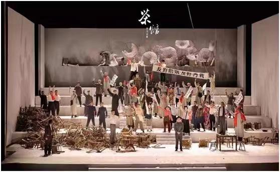 而全剧最具感染力的“仨老头撒纸钱”的一场戏被挪到最前面,作为序幕倒序开场,提前将悲惨结局告知给观众,消除其对结局的期待,转移到对剧情的关注和思考之中。结尾的处理沿用了人艺原版的方式,但表达方式更为震撼丰富,当“茶馆三老”撒纸钱时,满台的演员也纷纷撒起了纸钱,一台四轮吉普“轰隆隆”开上舞台,荒诞现实与凄凉悲惨交织缠绕,令人动容。原版结尾处并无音乐植入,而川话版则响起《团结就是力量》的音乐,几十名革命学生高举“反饥饿反内战”的标语登台,以摧枯拉朽之势打翻了旧社会的一切,打翻了茶馆堆砌的残余器具,也将半个世纪里茶馆内发生的无数人间故事就此了结。