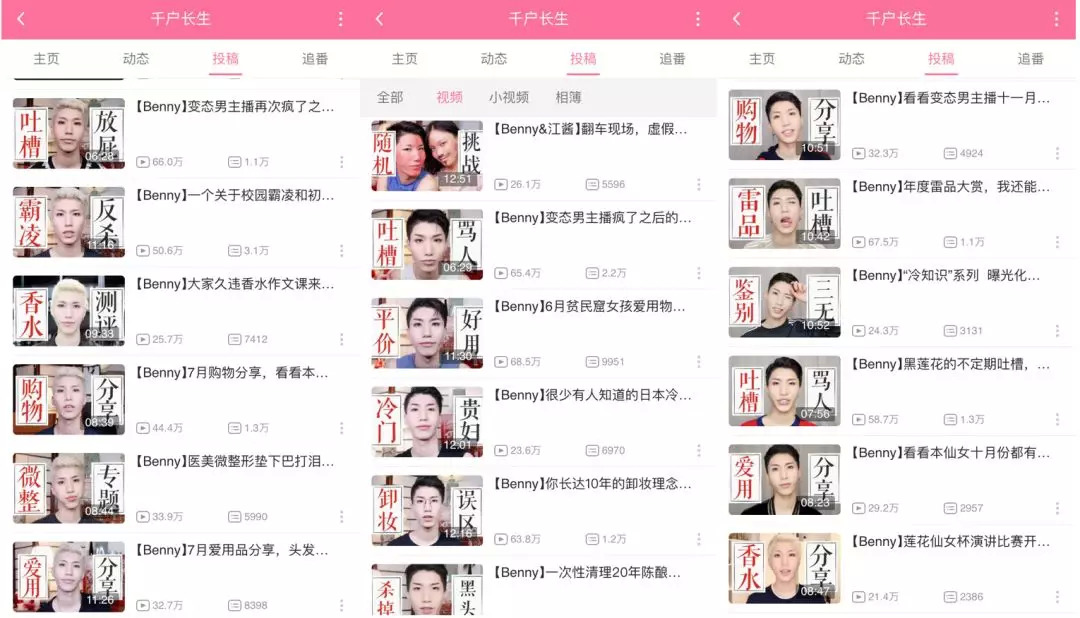 在Benny的视频分类中,吐槽、骂人等字眼格外高频,而且播放量惊人。“讲什么狗屁‘女德’”、“狂怼奇葩柜姐和奇葩顾客”等视频都是其出圈之作。