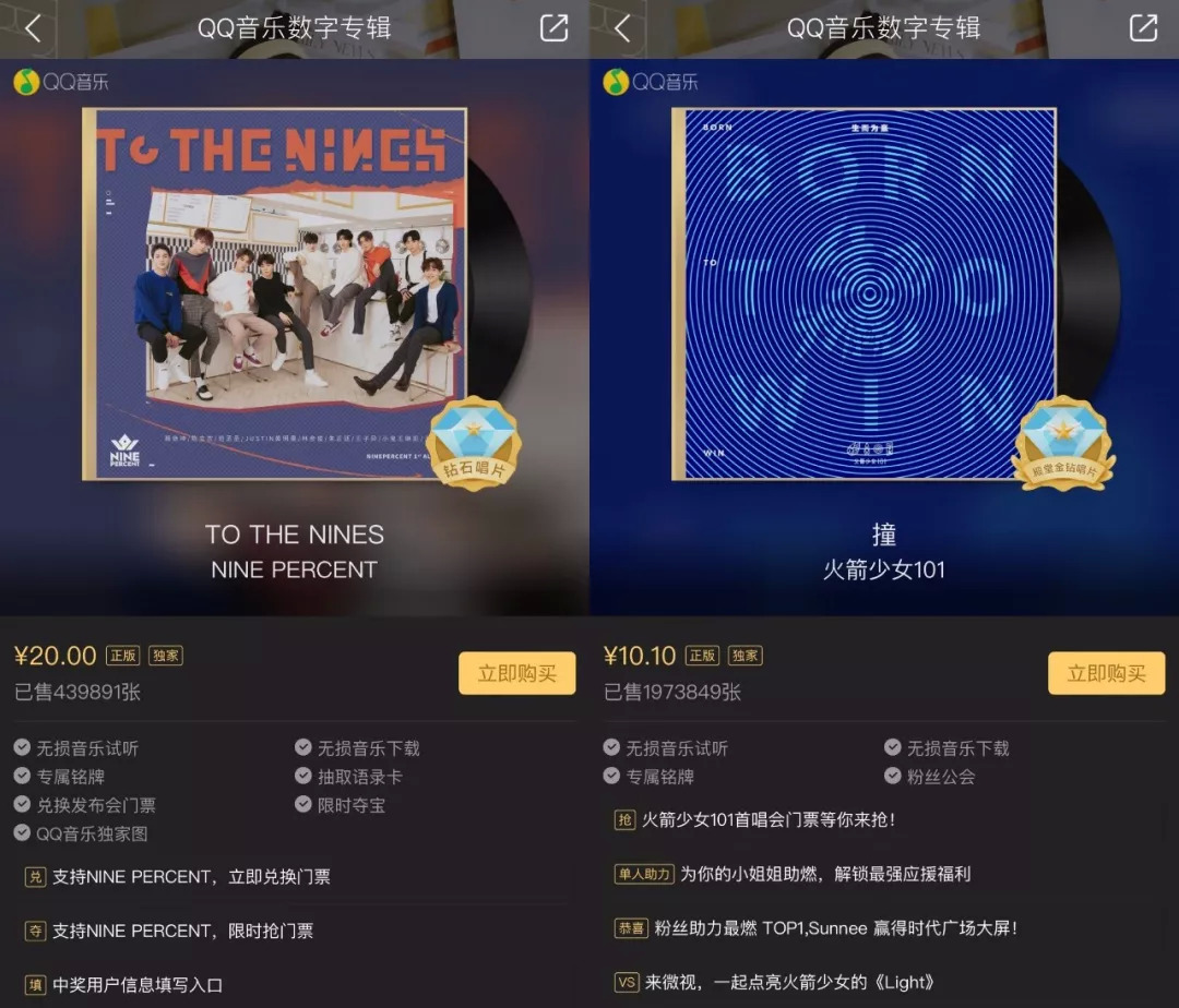 2018年4月,NINE PERCENT将上海粉丝见面会收入总计200万元,全部捐出给韩红爱心慈善基金会,NINE PERCENT的收入可见一斑。而NINIE PERCENT的首张专辑《TO THE NINES》目前在QQ音乐的销量已经达到了439891张,以20元的售价计算,收益已经近900万。同样,火箭少女的首张专辑《撞》销量达1973849张,以10元的售价计算,收益已经近2000万。