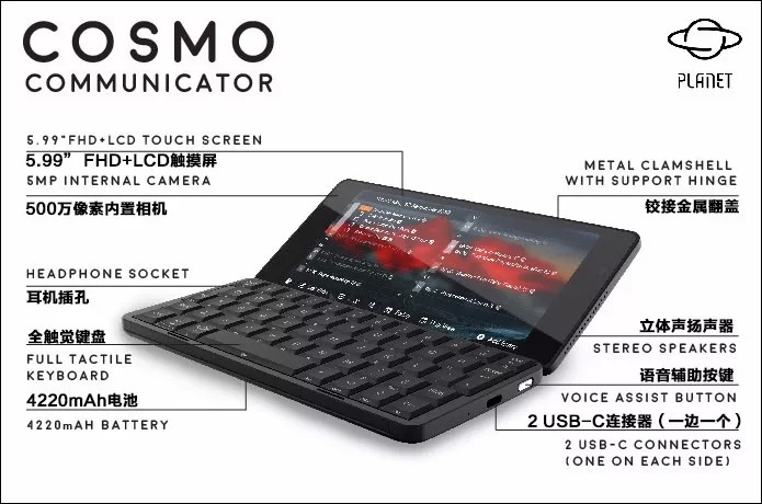 Planet Computers 将 Cosmo Communicator定义为集成键盘的现代双屏翻盖式移动通信器,融合电脑、手机、相机,究极一体化便携终端。