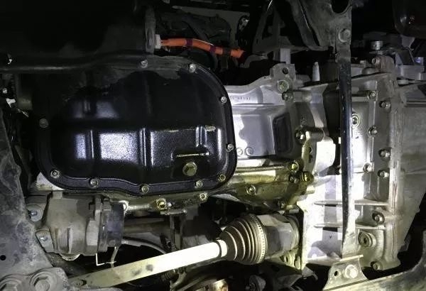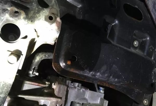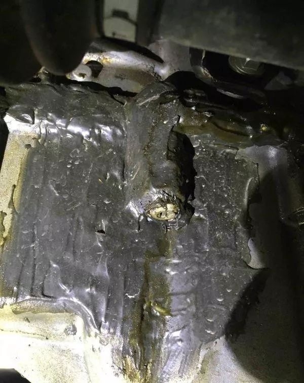 老爷们请看这辆车的油底壳,托底痕迹十分明显,而且还在漏油。你以为这是重新补焊的油底壳,其实拿的是高温密封胶封死的(就像补漆嵌腻子一样一样糊上去的)。