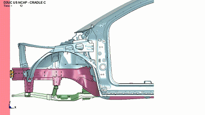 老爷们可以从上面的CAE分析图可以看出,正面情况下整个车辆吸能溃缩效果比较好,驾驶室没有任何变形。