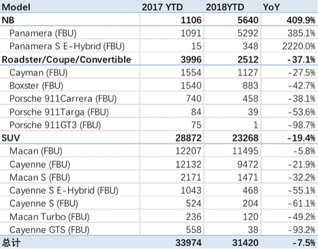 据统计,2017年保时捷在华总计销售71508辆,同比2016年增长10%;然而,2017年保时捷在华上牌量更是高达73199辆。2018年国内车市整体增长放缓的情况下,保时捷也没有逃脱下滑。今年上半年保时捷在华销售31420辆,同比下滑7.5%。