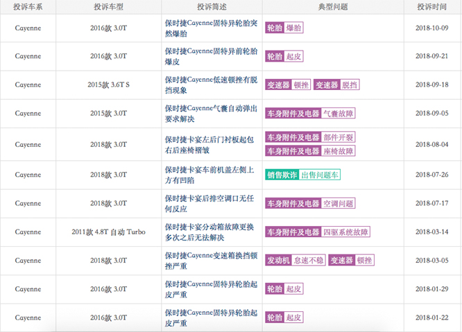 从口碑来看,近年来保时捷在华销量的攀升,也带来投诉量的大增,以前保时捷在华投诉量相对较少,当然与低保有量有关。来自车质网Cayenne车主投诉显示,仅2018年保时捷Cayenne就有13起投诉,涉及的问题主要还会轮胎起皮、开裂和爆胎较多;其次是车身附件及电器的故障率高,包括空调问题、座椅故障、部件开裂等小毛病,发动机仅有个案的怠速不稳和变速器顿挫和脱档的投诉。