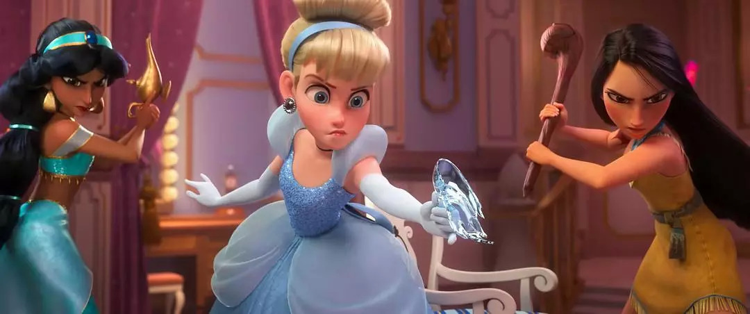 现在来看公主们,迪士尼自己都忍不住在《无敌破坏王2》自嘲,当其他公主拿起各自的武器对准闯入的云妮洛普的时候,灰姑娘当机立断敲断了定情信物水晶鞋,抄起了半截玻璃碴——不,你一定是假的辛德瑞拉。
