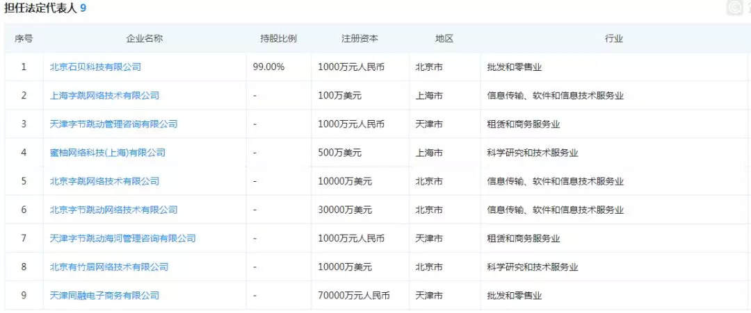 麻辣娱投(id:malayutou001)记者在企查查发现,张一鸣在9家字节跳动系企业担任法人代表。