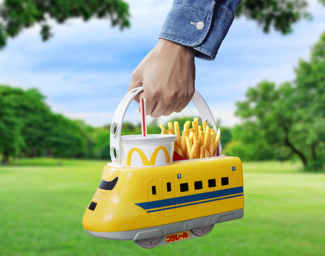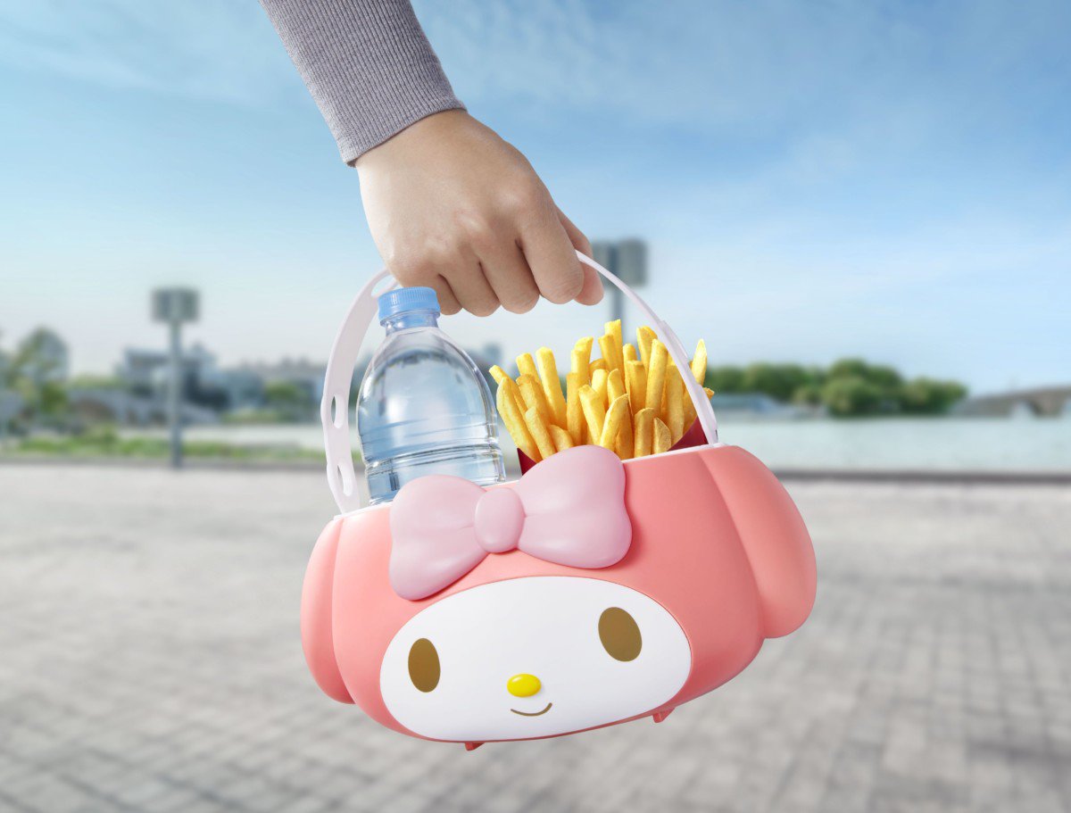 日本麦当劳近日刚发售的一款收纳盒就解决了这样的问题。这是一款与三丽鸥旗下的美乐蒂和日本经典玩具Plarail联合推出的饮料薯条收纳盒,可以挂在汽车座位后防止泼洒、或是拿在手中作为野餐道具,售价为890日元(约为人民币55元)。