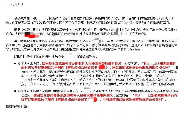 除了他,他还有29名部门同事统一收到公司协商辞退邮件,他们是同一批次入职的。这些邮件如出一辙,辞退理由统一都是:公司业务框架调整。