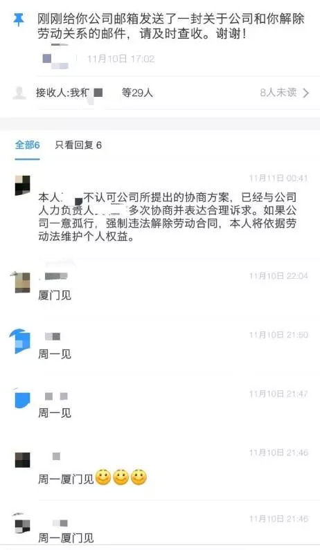 但是,还没到邮件所说的11日,人力就在10日将自己和其他29名同事从钉钉中移除出去了。