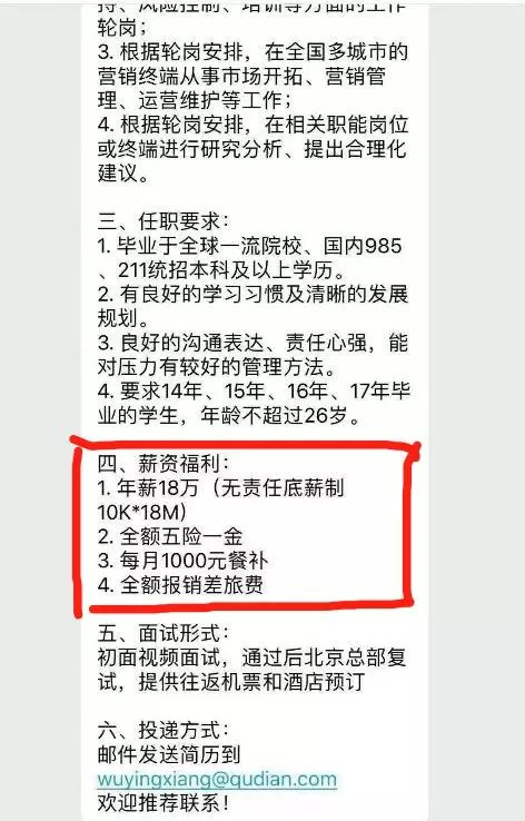趣店的招聘海报表明,职位的薪资福利是无责任底薪18万,每月1000元餐补。