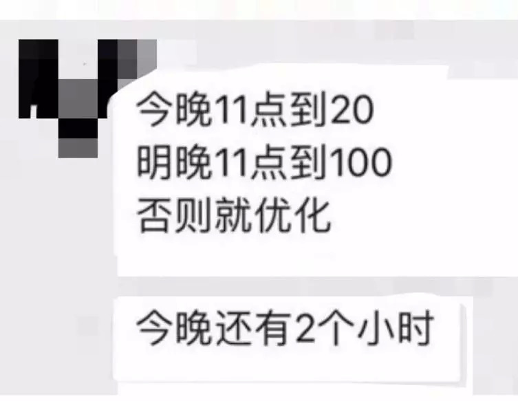 项目负责人在群里公布最后时限,在当天晚上11点要拉到20人,隔天晚上11点要拉到100人,否则就“优化”。