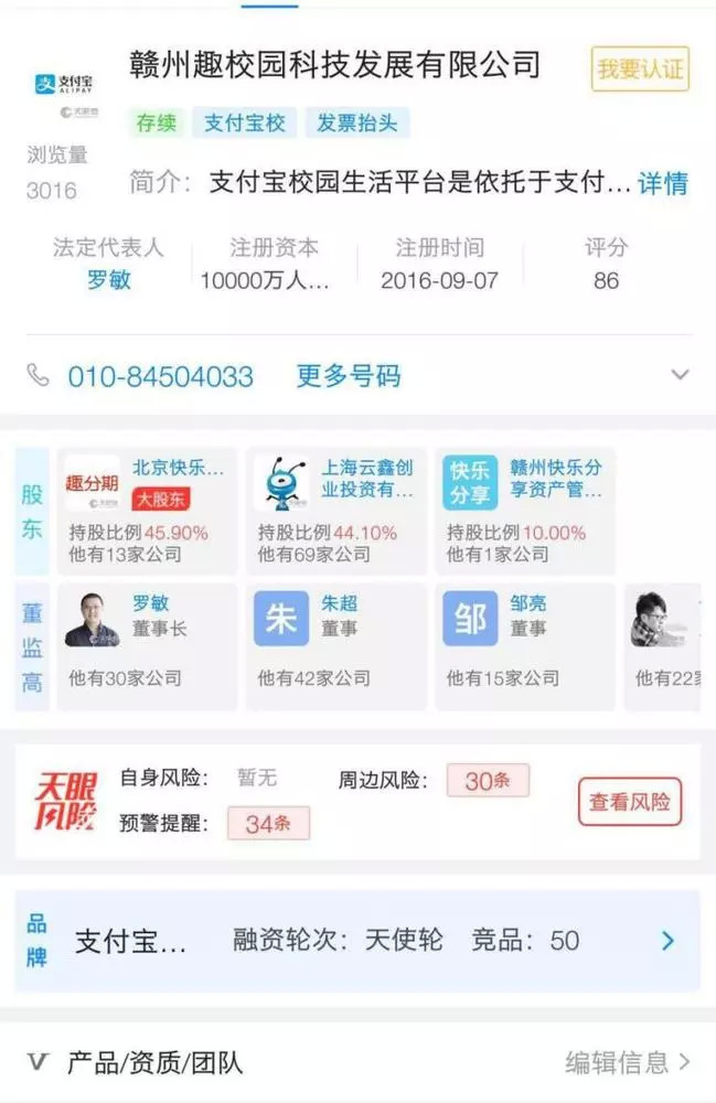 然而,刘平、孙武和许清风都表示,学生信息泄露大有可能。因为支付宝的“大学生活”入口是由一家叫“趣校园科技”的平台上在运营,隶属于赣州趣学习科技发展有限公司,公司实际控制人则是罗敏。