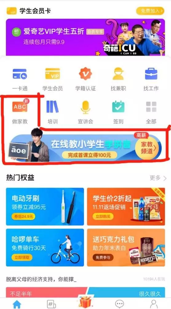 进入支付宝的“大学生活”入口,页面上新设立了一个叫做“做家教”的板块。用户点进去,就会马上跳转到趣学习平台,可以注册当讲师。